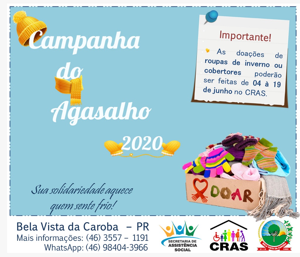 A Secretaria Municipal de Assistência Social informa que realizará entre os dias 04 à 19 de junho a Campanha do Agasalho para atender e aquecer aqueles que precisam.