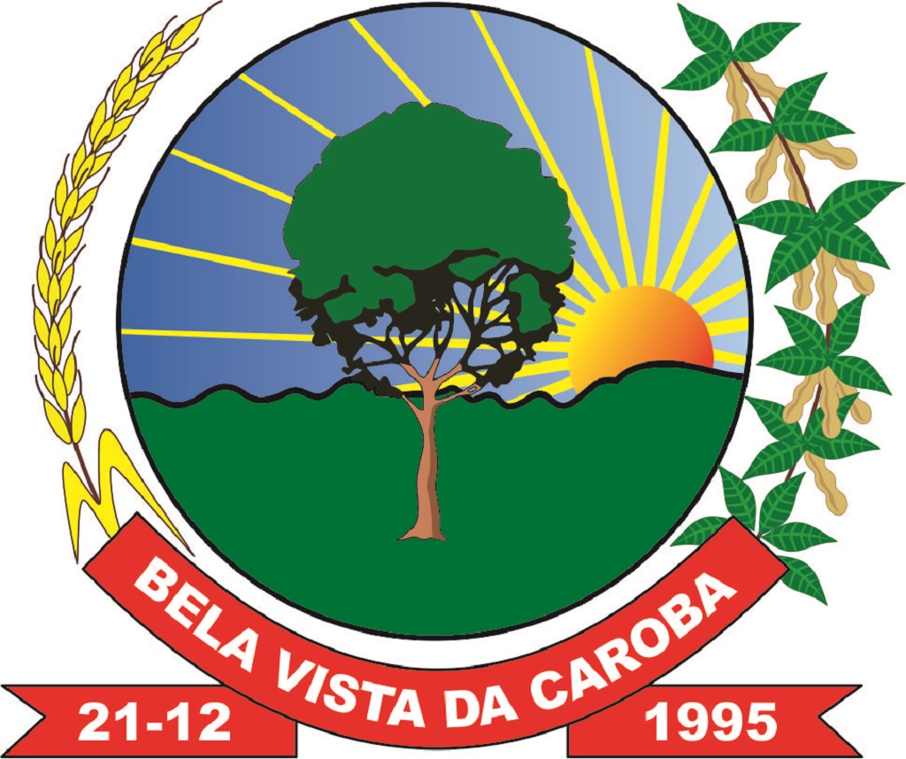 Brasão: O Brasão do Município é composto da seguinte forma: Escudo clássico composto por uma circunferência; a circunferência está ladeada por um ramo de trigo com cacho maduro do lado esquerdo e um ramo de soja com vagens maduras do lado direito, com os seguintes dizeres na tarja circunferência: BELA VISTA DA CAROBA 21-12-1995 com a cor da tarja vermelha e a letra branca. Na circunferência traz um sol desenhado ao lado direito, com raios refletindo em direção ao meio até a extremidade da circunferência; com uma árvore da espécie CAROBA, ao centro da circunferência, a qual representa parte do nome do Município. |