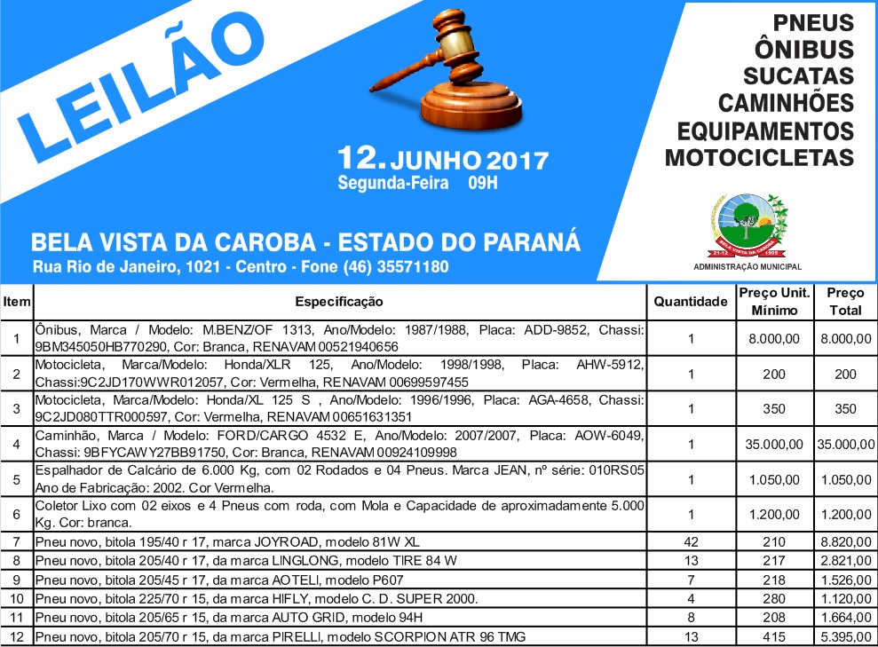 OBJETO:LEILÃO DE EQUIPAMENTOS, ÔNIBUS, CAMINHÕES, MOTOCICLETAS, PNEUS E SUCATA DA PREFEITURA MUNICIPAL DE BELA VISTA DA CAROBA.